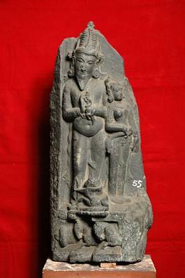 | Description / विवरण | Pingala, Surya's scribe holding a pen and an ink bottle, with a female chauri bearer. Fragment of a stele representing Surya and his attendants. |