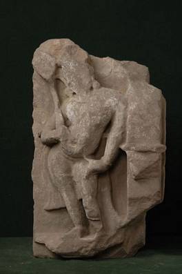 | Description / विवरण | Architectural fragment showing a standing male figure holding a long stalk in his right hand while the left hand is placed on left thigh. |
