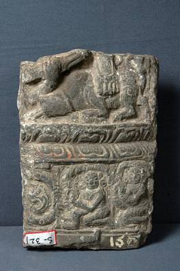 | Description / विवरण | Pedestal fragment of a stele representing Mahisasuramardini. One foot of Durga on the beheaded bull is visible. Worshippers are depicted below. |