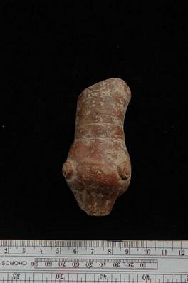 | Description / विवरण | Terracotta spout representing the head of an animal which has round eyes. Mouth damaged and painted brown. |