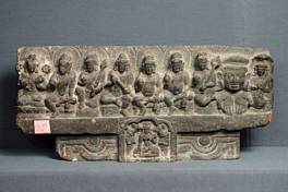 | Description / विवरण | Navagraha slab representing the nine planets Surya, Chandra, Mangala, Budha, Brhaspati, Shukra, Shani, Rahu and Ketu. Gajalakshmi has been depicted below seated cross-legged with an elephant on each side. |