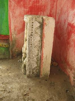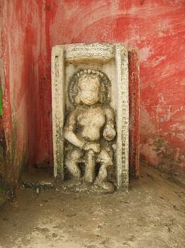 | Description / विवरण | The two handed image is in standing phase. It is difficult to recognize whether it is a male or female figure. The hair is matted.Face is eroded.In between two legs is found a club on which right hand rests.Over the body of image lime wash has been done. Image is fixed in cement floor. |