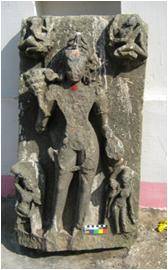 | Description / विवरण | The two handed image is in standing pose.Halo is oval.Two flying vidydhara is are flanking top corners.On lower right an image of ascetic is depicted who is holding his jata. The hair style of the deity is Jatamukute . On right hand Kartikuya holds a ketaki flower left probably holding a cock which is broken now. |