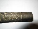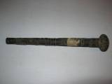 | Description / विवरण | This is a brass made handle used as the handle of a cane stick. Top is round shaped having ornate carvings. The handle is tapering and is in two parts by grooves in the middle. Both parts are carved with hous,e hut, tree and load bearer male and female. On head beautiful land scape is created byetching. It looks black, due to loss of its shining. |