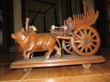 | Description / विवरण | This is a model of a bullock cart drawn by two bullocks. Both bullocks have raised their one leg. Looks very live pulsating. Cart has dabble wheel with spokes. Cart is very ornate and typical to that time. A person is sitting on the cart with a raised a stick in his right hand. This model is fixed with a wheeled platfom. |
