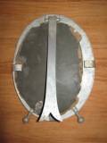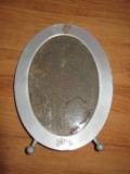 | Description / विवरण | This is a mirror. It is shaped as oval. Fome is made of aluminium.with two legs. Leg a oval shaved glass mirror with the back having a paper hard board supporting the mirror. A stand on. The back with its end like a fish tail. |