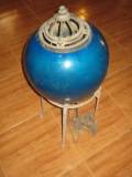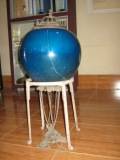| Description / विवरण | The glass lamp is blue in colour. It has some portions made of chains hanging down. The other portion also has a metal circular top to contain the object. |