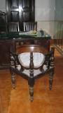 | Description / विवरण | One four legged decorated chair having three carved long legs and one short leg at front. Supporting floral designed brackets are given on both sides of the front leg. Back is designed as an arch and arms are supported by formal wood cut plaques. Legs are circular and pointed at bottom and rectangular in upper portion. |