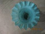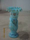 | Description / विवरण | A sky coloured glass flower vase, has a wavy rim and painting of flora in various colours. One right hand holds the jar as a flower. Base is oblong in shape. Dotted design below the rim. |