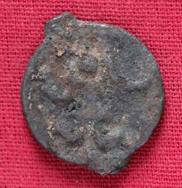 | Description / विवरण | The shape of the Coin is circular. Obverse -A Kushana type king standing with his right arm curved upwards and left arm curved downwards. Reverse -Probably, a standing figure of MAO or Moon-God with right arm curved upwards and the crescent above the left shoulder. The left arm is not visible. |
