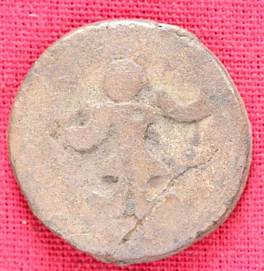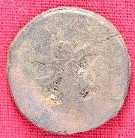 | Description / विवरण | The shape of the Coin is circular. Obverse -A Kushana type king standing with his right arm curved upwards and left arm curved downwards. Reverse -Probably, a standing figure of MAO or Moon-God with right arm curved upwards and the crescent above the left shoulder. The left arm is not vi |