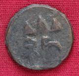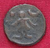 | Description / विवरण | The shape of the coin is circular. Obverse Probably the figure of MAO or Moon God with right curved upwards and left arm curved upwards and the crescent above the left shoulder. Reverse Three hills or cone like objects placed in a straight line and below them some letters are inscribed. |