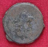 | Description / विवरण | The shape of the coin is circular. Obverse Kushana type king, standing with his right hand curved upwards and his left arm extended. Reverse Probably the figure MAO or Moon-God with his right arm curved upwards and the crescent above the left shoulder. |