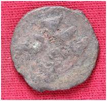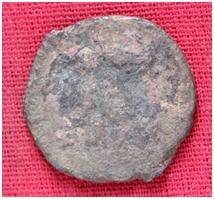 | Description / विवरण | The Shape of the Coin is Circular. Obverse Probably a standing figure of MAO or Moon-God with the crescent above the left shoulder, hands of figure is not clearly visible, wears tunic and boots. Reverse Legend or Script below the three hills or three conical objects. |