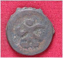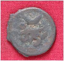 | Description / विवरण | The Shape of the Coin is Circular. Obverse A Standing figure of Kushana type king, with upwards curved right hand and outstretched left hand, wears boots and tunic. Reverse Probably a standing figure of MAO or Moon-God with upwards curved right hand and left hand is not visible, the crescent above the left shoulder. |