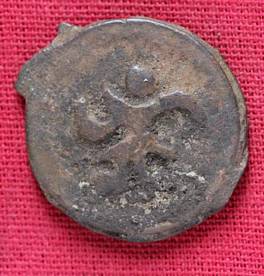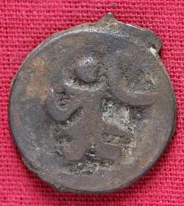| Description / विवरण | The shape of the Coin is circular. Obverse -A Kushana type king standing with his right arm curved upwards and left arm curved downwards. Reverse -Probably, a standing figure of MAO or Moon-God with right arm curved upwards and the crescent above the left shoulder. The left arm is not visible |