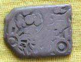 | Description / विवरण | This is an imperial type of punch marked coin. It is irregular in shape. Obverse Sun, six armed wheel, taurine, caduceus. Reverse Minute symbol. |