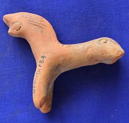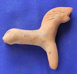 | Description / विवरण | Model of an animal figurine with a long neck. Eyes are represented by pellets of clays. Five circular punches and incised oblique lines all over the body. Face and hind legs are missing. |