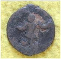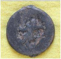 | Description / विवरण | The shape of the coin is circular. Obverse-Kushana type king standing with his right hand upwards and left hand down wards. Reverse-- probably the figure of MAO or Moon God- with right arm curved up wards and the crescent above the left shoulder. |