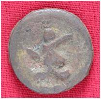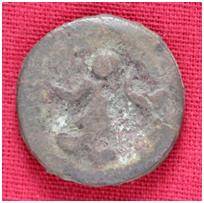 | Description / विवरण | The shape of the coin is circular. Obverse- Kushana type king standing with his right hand upwards and left arm extended. Reverse-- probably the figure of MAO or Moon God- with right arm curved up wards and the crescent above the left shoulder. |