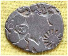 | Description / विवरण | The coin is an imperial type of Punch- marked Coin. The shape of the coin is oval. Obverse Sun, Six armed wheel, animal, bull and two arched hill. Reverse Four taurine within a circle and other symbol is indistinct. |