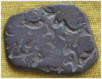 | Description / विवरण | The coin is an imperial type of Punch- marked Coin. The shape of the coin is irregular. Obverse Sun, tree, three arched hill, bull, Six armed wheel, a circle flanked by two taurines. Reverse Blank. |