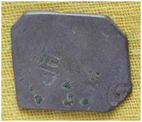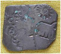 | Description / विवरण | The coin is an imperial type of Punch- marked Coin. The shape of the coin is irregular. Obverse Sun, animal, bull, Six armed wheel, an animal stands above the hill. Reverse A fish within a circle, a square box and other symbols are defaced. |