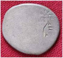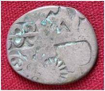| Description / विवरण | The coin is an imperial type of Punch- marked Coin. The shape of the coin is oval. Obverse Sun, caduceus, Six armed wheel, animal and an animal stands above the hill facing towards right. Reverse Sun. |