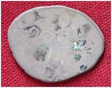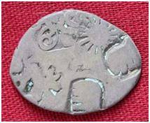 | Description / विवरण | The coin is an imperial type of Punch- marked Coin. The shape of the coin is oval. Obverse Sun, Six armed wheel, an animal stands above the two arched hill, two animals. Reverse Sun, four dots around a cross and other symbols are defaced |