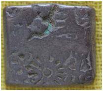 | Description / विवरण | The shape of the coin is square. Obverse Sun, Caduceus, Six armed wheel, human, an animal. Reverse Mountain. |