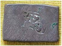 | Description / विवरण | The shape of the coin is rectangular. Obverse Five arched hill, peacock right above the three arched hill, shield with spears, human and another symbol is indistinct. Reverse Bird right above the five arched hill. |