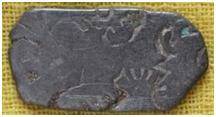 | Description / विवरण | The shape of the coin is irregularl. Obverse Sun, Bull, Six armed wheel, animal, tree, three arched hill. Reverse Indistinct symbols. |