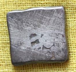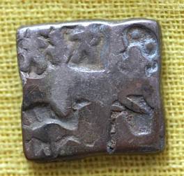 | Description / विवरण | The coin is irregular in shape. It was imperial type of coin. Obverse The coin Contains the symbol of two human figures and one bird. Other symbols are indistinct. Reverse The symbol of a sun. |