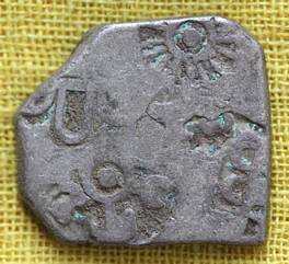 | Description / विवरण | The coin is imperial type of punch mark coin. The coin is irregular in shape. Obverse Contains the symbols of Sun, six- armed wheel symbol, and moon. Reverse Blank. |