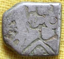 | Description / विवरण | The coin is the imperial type of punch marked coin. It is irregular in shape. Obverse Sun, moon, six- armed wheel, Mountain. Reverse Mountain. |