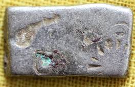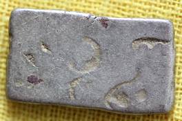 | Description / विवरण | The coin is the imperial type of punch marked coin. It is rectangular in shape. Obverse Sun, fish, Mountain. Reverse Crescent, three dots, river. |
