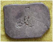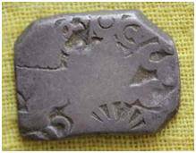 | Description / विवरण | The coin is an imperial type of Punch- marked Coin. The shape of the coin is irregular. Obverse Sun, Six armed wheel mountain and Bull. Reverse Tree and other symbols are defaced. |