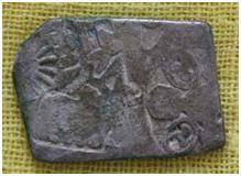 | Description / विवरण | The coin is an imperial type of Punch- marked Coin. The shape of the coin is pentagonal. Obverse Sun, Six armed wheel, bull, an animal stands above the hill. Reverse The symbols are indistinct. |