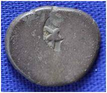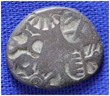 | Description / विवरण | The shape of the coin is irregular. Obverse Sun, Six armed wheel, animal, two trees, three arched hill with a crescent at the top. Reverse One indistinct symbol. |