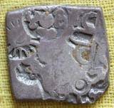 | Description / विवरण | The coin is the imperial type of punch marked coin. It is square in shape. Obverse Sun, three arched gate, six armed wheel, four taurines around a circle. Reverse Minute symbols. |