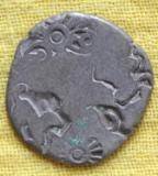 | Description / विवरण | The coin is imperial type of punch marked coin. It is rounded in shape. Obverse Sun, six armed symbol, bull, animal. Other symbols are indistinct. Reverse Blank. |