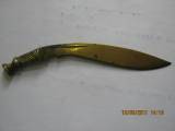 | Description / विवरण | A small brass knife, with semi-circular shape like a kukri. Single edged tip is pointed, groove is noticed on both sides. Hilt has groove marks in oblique and horizontal pattern. |