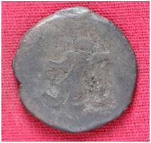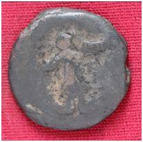| Description / विवरण | The Shape of the Coin is Circular. Obverse A Standing figure of Kushana type king, with uplifted left hand and extended right hand, wears short tunic and boots. Reverse Probably a standing figure of MAO or Moon-God with outstretched right hand and left hand blurred a crescent above the left shoulder, wears boots tunic. |