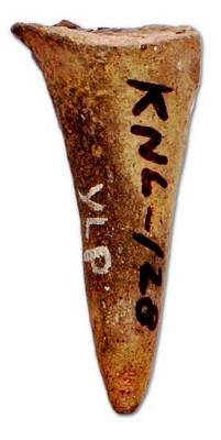 | Description / विवरण | Leg of a red ware pot with flat base and straight conical foot end. It looks like a horn of bull . |