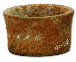 | Description / विवरण | Red ware pot with sagger base and sloppy shoulders, everted splayed out rim, a row of triangular designs on the shoulder drawn with nail in between chevourn bands on the carinated waist and the neck. |