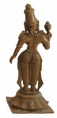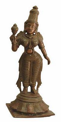 | Description / विवरण | Standing figure of Sridevi in Tribhanga posture on a pedestal holding a lotus bud in right hand raised up, where as her left hand hangs down freely and kept slightly away from the body. |