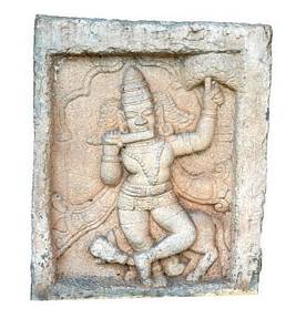 | Description / विवरण | Venu Gopala playing flute with right hand standing in tribhanga posture with the left leg bent towards right and the toe raised. The fore finger of the right hand is shown lifting the mountain Govardhana. At the foot, behind Krishna is a cow to the left with head turned right ward. Head dress is karandamakuta. Ornaments include a necklace, long flowing hara, udarabandha and katisutra. |