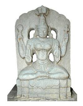| Description / विवरण | Devi seated in padmasana posture on a lotus pedestal. She wears kiritamakuta with a wide pattika or band around the head. The two rear hands hold pasa and damaru while the two front hands hold trident and staff. There are necklaces, flowing garland like haras with a pendant and kuchabanda as well as waist-band katisutra . Drapery is depectied with folds seen faintly. |
