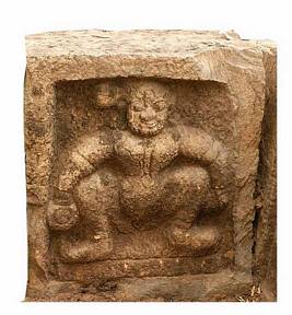 | Description / विवरण | Erotic figure of a female seated on legs apart and her left hand placed on the left knee while her right hand holds a pot. She wears a simple head dress. |