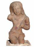 | Description / विवरण | Standing torso with disheveled hair and long ears with kundalas. The right hand is missing where as the left hand is bent inwards and hold a staff. Waist slightly bent causing tribhanga posture. Adorned with a hara on the chest, yajnopavita and katisutra. The image is nude. Portion below the legs is absent. |